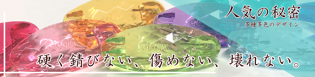 従来から有る安全ピン(ニッケルメッキ)から、硬く錆びないステンレス製に針を変え、頭部はプラスチックにして色彩豊かにしました。